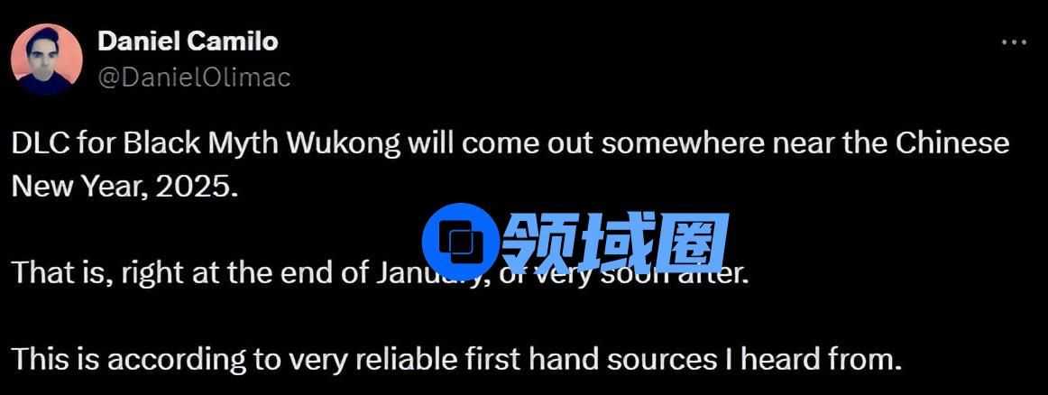9月15日,海外游戏媒体GamesIndustry撰稿人、常驻深圳的游戏行业顾问Daniel Camilo发推表示,《黑神话:悟空》的首部DLC将于2025年农历新年时发售,且称这个消息来自某个“非常可靠的一手信源”。