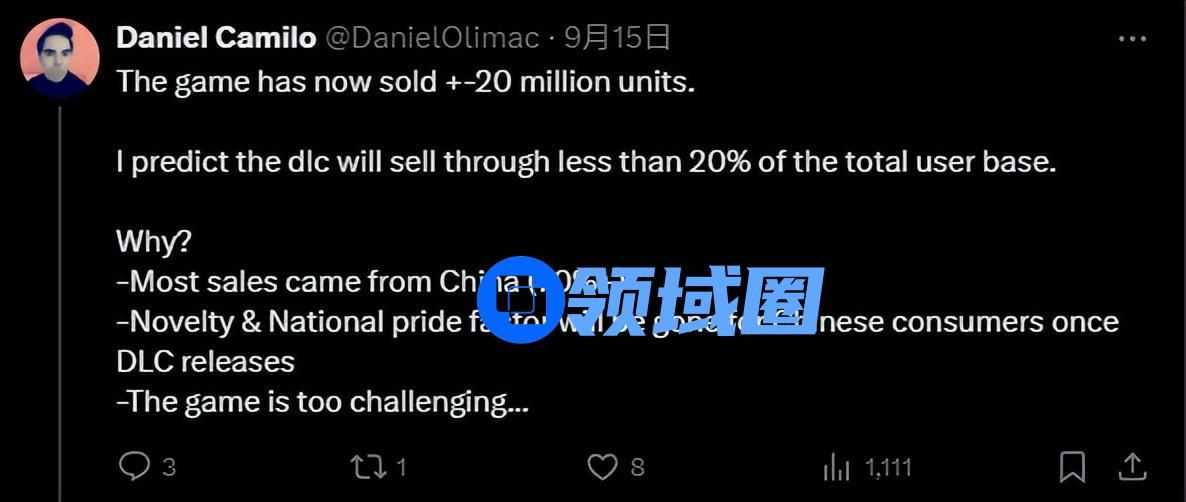 Daniel Camilo同时预测,《黑神话:悟空》的DLC销量将不足总用户量的20%,因为“70%销量来自中国”,且“DLC发布时,中国的文化情怀热潮已经退却”,更别提“游戏太难”。