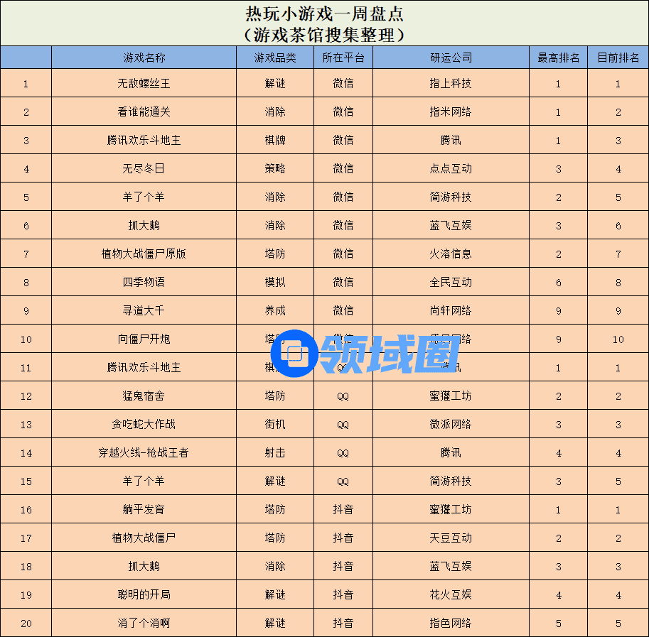 休闲新游周报每周统计微信小游戏、QQ小游戏、抖音小游戏、硬核小游戏以及App Store和Google Play上的新游爆款,并按照分类制作表格,将游戏排名情况等信息公布,希望给到行业同侪帮助。