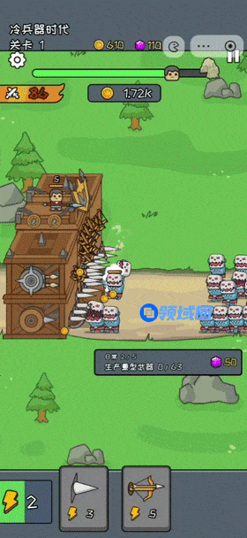 其中《尸潮战车》是一款休闲塔防小游戏,玩法类似于海外厂商SayGames于今年8月发行的《Tower Destiny Survive》。在《尸潮战车》中,玩家需要耗费能量为我方战车装备武器,来对抗迎面袭来的僵尸群,如果战车被僵尸群攻下,则游戏结束,玩家能够获得对应的金币奖励。其中能量的产生需要一定时间才能完成累计,英雄的血量也能为我们争取一定的反击时间,因此为了有效提升我方胜率,我们需要在场外,花费金币对能量增长速度和英雄血量进行提升,还可以通过卡牌养成的方式,直接提升武器伤害。