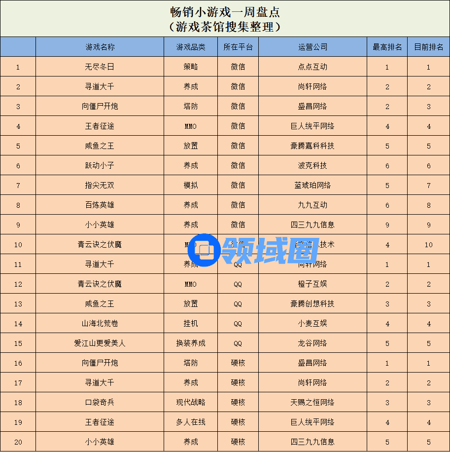 本周统计数据截取9月9日到9月17日各大平台榜单排名情况,共制作热玩小游戏、畅销小游戏和休闲手游三项排名表格。