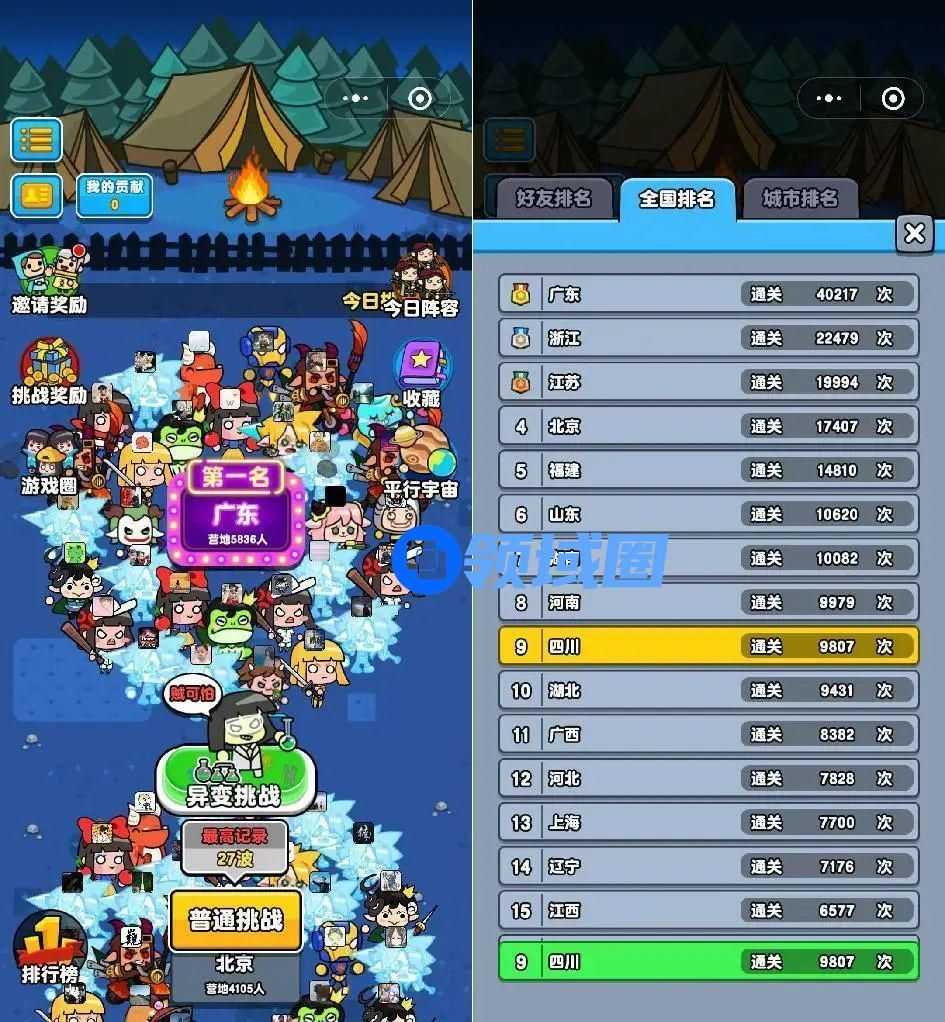 为了匹配游戏的变现模式,该游戏干脆直接将内容重心放在了社交上面。比如游戏的主界面,就参考了《羊了个羊》的地区排名设计,还增加了好友排名、全国排名、城市排名三个排行榜,全方位刺激玩家的竞争意识。