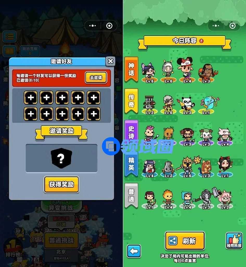 此外,为了借社交传播之力,催化玩家二次裂变,推动游戏破圈,该游戏不仅在主页上特别添加了“邀请十个好友获奖励”的选项,还直接放弃了游戏中的抽卡和养成模块,将英雄通过固定阵容的形式呈现出来,玩家想要更换刷新英雄阵容,就需要分享或者观看广告。