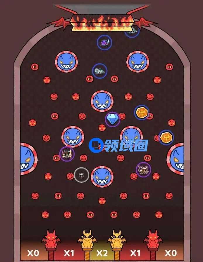 在《Hellbounce: Merge Defense》中,只存在一种单人闯关模式,且游戏场地变成了我们熟悉的弹珠台。与《Lucky Defense!》一样,该游戏中玩家花费金币随机召唤出来的英雄,会随机分布在弹珠台预设的点位上(即图中小圆点的位置),玩家可以根据需求对英雄位置进行调整,可以将两个同类英雄进行合成,随机获得更高一级英雄,还可以根据公式将厂商的几个英雄进行合成,召唤传说级英雄。