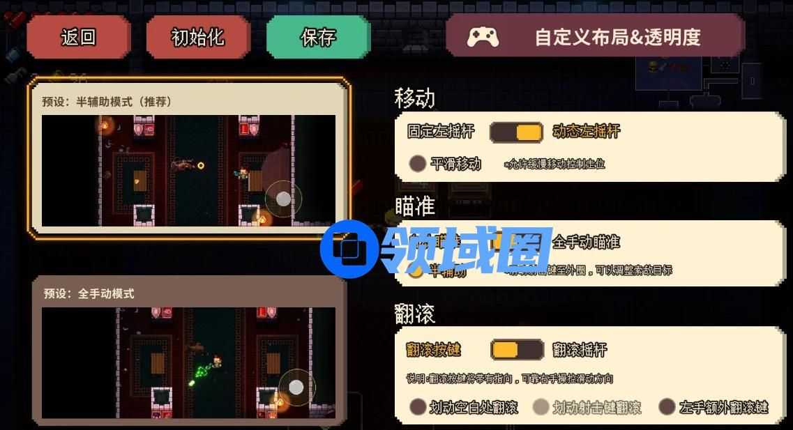 当然,选用自动瞄准还是全手动瞄准,还是使用“半辅助”效果,可以根据操作习惯,在自定义设置里进行调整。这里包含了移动、瞄准、翻滚。以翻滚举例,如果你喜欢将移动和翻滚都交给左手操纵,你甚至可以在左边额外增加一个翻滚键。