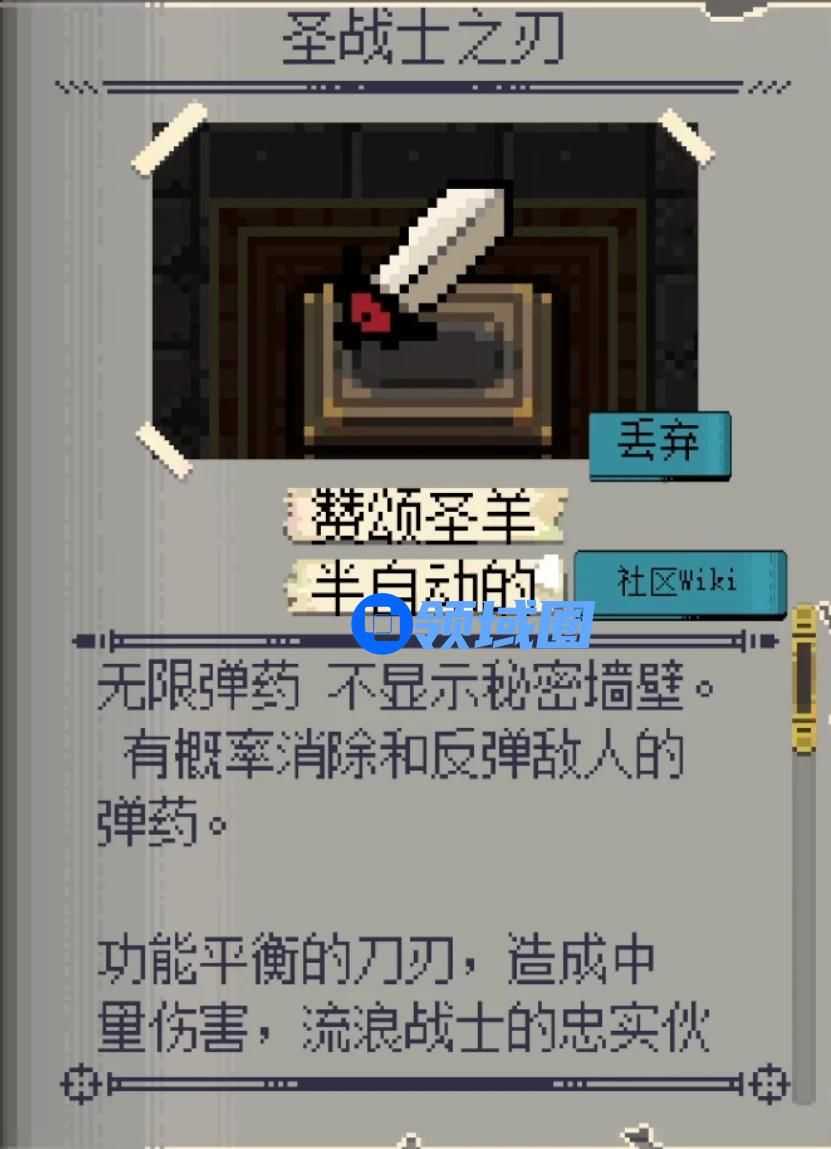它手中的剑,甚至强于渎神,可以消除甚至反弹子弹,满血时与渎神一样可以发射剑气。对于新手来说,需要玩很久才会解锁的人物“子弹人”初始的近战武器,在联动期间,使用咩咩教主就可以提前试用。