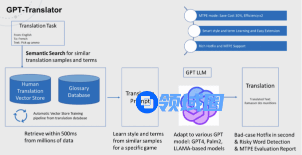 GPT-Translator由腾讯Level Infinite AI技术团队与本地化团队自研开发,采用了先进的语义搜索和深度学习技术,能够在500毫秒内从数百万条数据中找到最相关的内容,并达到人类专家翻译的90%的准确度,让研发团队能够在不熟悉的语言领域中快速、高效地进行翻译和验证工作。