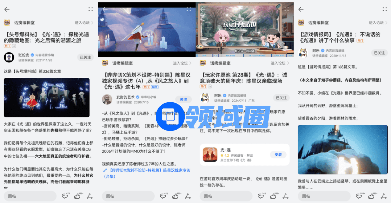例如,华为游戏中心从《光·遇》上线伊始便持续跟进,过去五年来,持续为玩家展示游戏重要时刻、资讯等,平均单帖阅读30万+等,多方面助力游戏内容分发,收获玩家喜爱,伴随这款“小众游戏”一步步成长为全球用户破亿的热门游戏。发布初期,通过专访制作人陈星汉向用户玩家讲述了游戏制作背后的故事;基于多位小编亲身游戏体验,给《光·遇》打出了9.0的高分并不断输出最新玩法攻略……