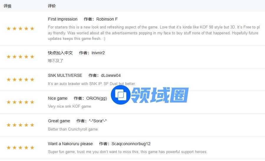 数据霸榜是一方面,在商店评论区,众多欧美玩家也对该作表达了高度认可,诸如“3D画面很精美”、“大招炫酷”、“玩法丰富”、“比XX游戏要好”、“很良心”等关键词出现频次居多,尤其是对情怀方面的满足,《SNK: All-Star Brawl》正所谓“做对了菜”,在宣发层面能让欧美玩家主动形成自来水,为该作的用户拉新、日活以及长期留存打下了扎实的基础。