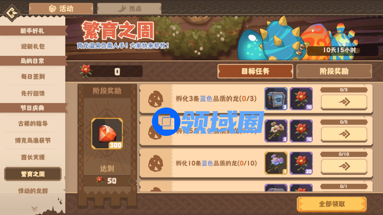 活动说明:完成主线关卡3-5后可获得道具圆润卵石,使用圆润卵石修复育龙温泉后即可开启活动。完成活动专属系列任务即可获得当前任务奖励及龙巢新枝,积累一定数量的龙巢新枝后还可领取红宝石、白绵羊等道具。
