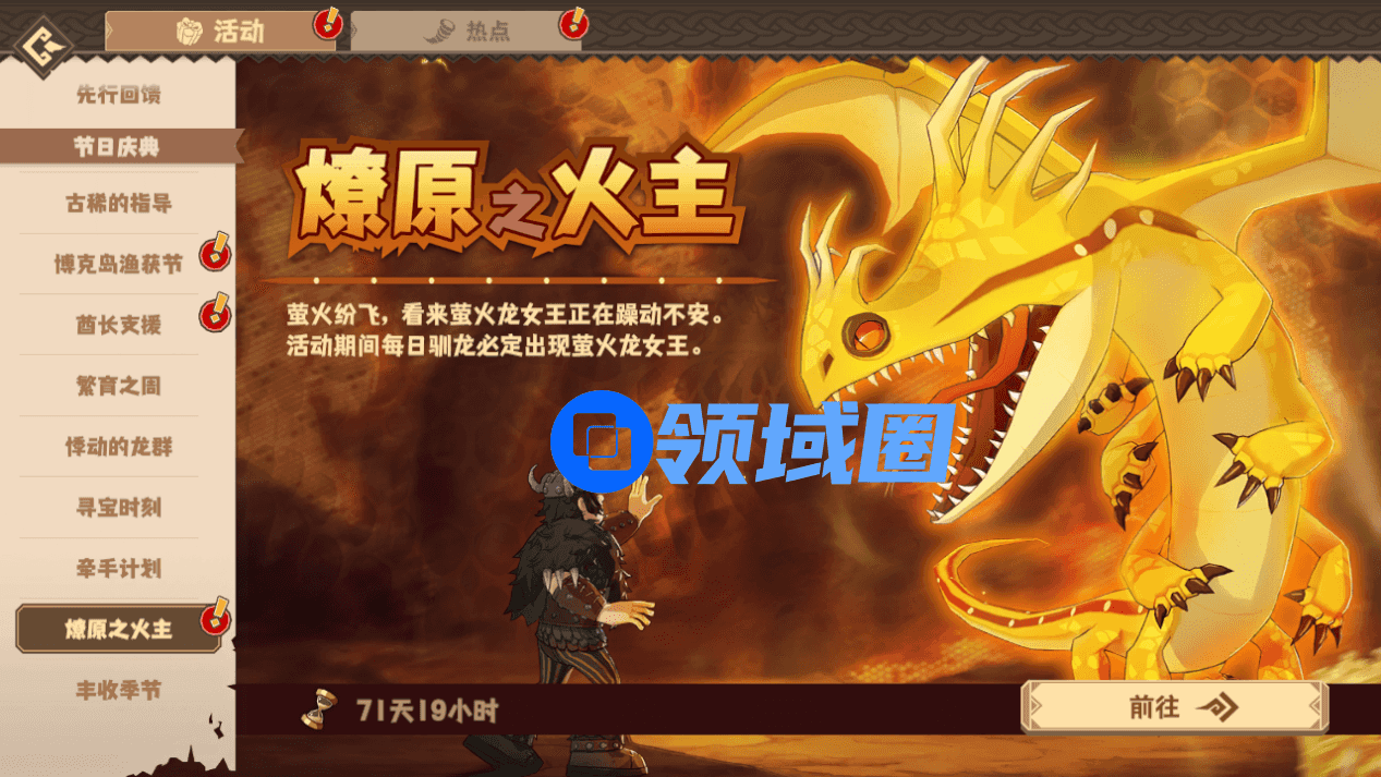 活动说明:活动期间,每日驯龙必出现萤火龙女王。在【活动】-【燎原之火主】界面点击【前往】按钮,可直达驯龙关卡。