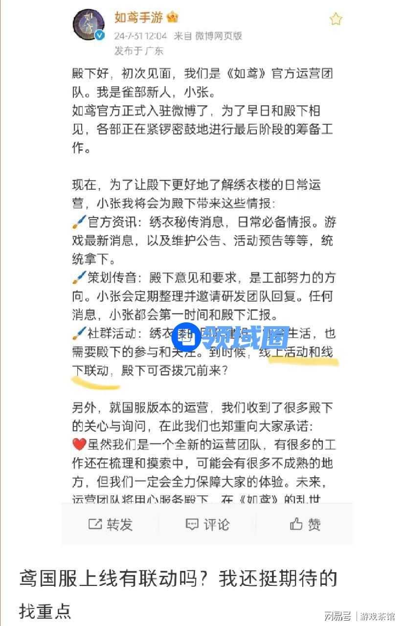 《如鸢》官号作为官方与玩家交流的重要阵地,将会发布官方资讯,包括活动预告、版本更新等内容,让玩家一手掌握游戏动态。官号还将成为游戏研发团队与玩家沟通的重要桥梁,雀部小张会收集玩家反馈,定期整理并邀请研发回复,不断优化游戏体验。此外,游戏官号阵地还将定期举办社群活动,构建活跃和谐的玩家社区。《如鸢》官号开通后,不少玩家对这款新作表示期待。