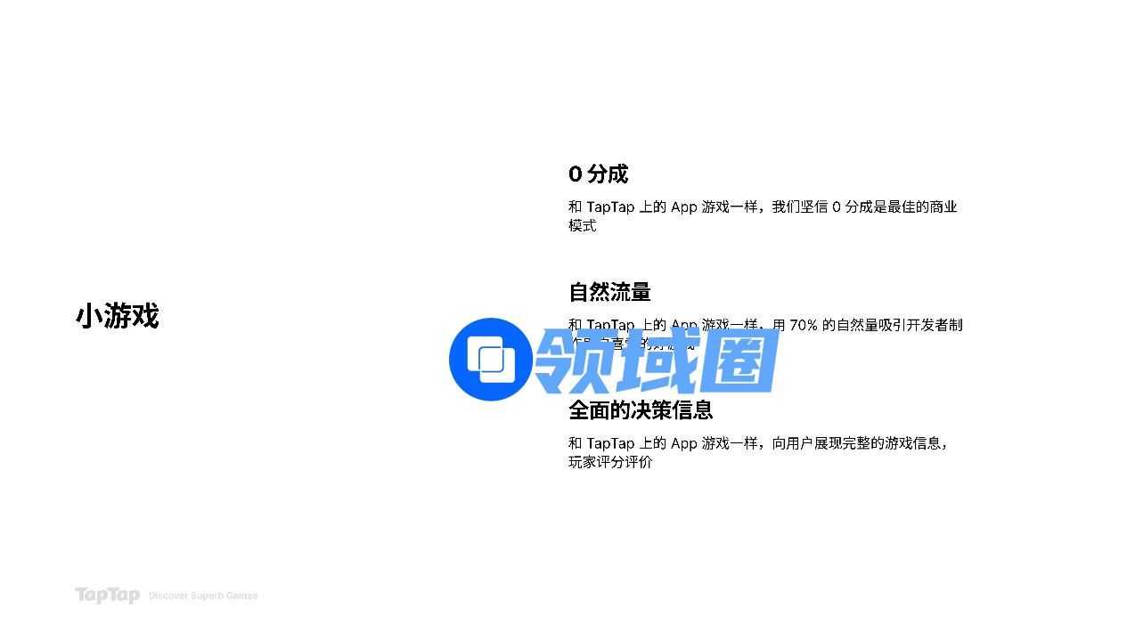 还想跟大家分享的是,我们尝试 TapTap 小游戏。我们把它当作一个技术能力,能给玩家更好的体验,就是用户不需要再把游戏下载到本地安装,特别是对于 TapTap 这样的第三方应用商店来说,是对用户体验有非常大帮助的一件事。我们虽然叫「小游戏」,但大型 3D 游戏也可以获得比较好的支持。小游戏也会坚持零分成,这是我们坚持的最佳商业模式。
