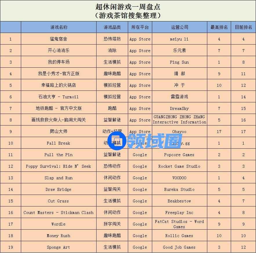 超休闲游戏方面,在App Store免费游戏榜单中,恐怖元素的休闲塔防游戏《猛鬼宿舍》空降榜首,乐元素《开心消消乐》和模拟游戏《我的停车场》分别拿下了榜单第2和第3名。在Google Play免费游戏榜单中,动作游戏《Fall Break》登上榜首,解谜玩法的《Pull the Pin》和恐怖动作游戏《Poppy Survival: Hide N' Seek》分别位于榜单第2和第3名。