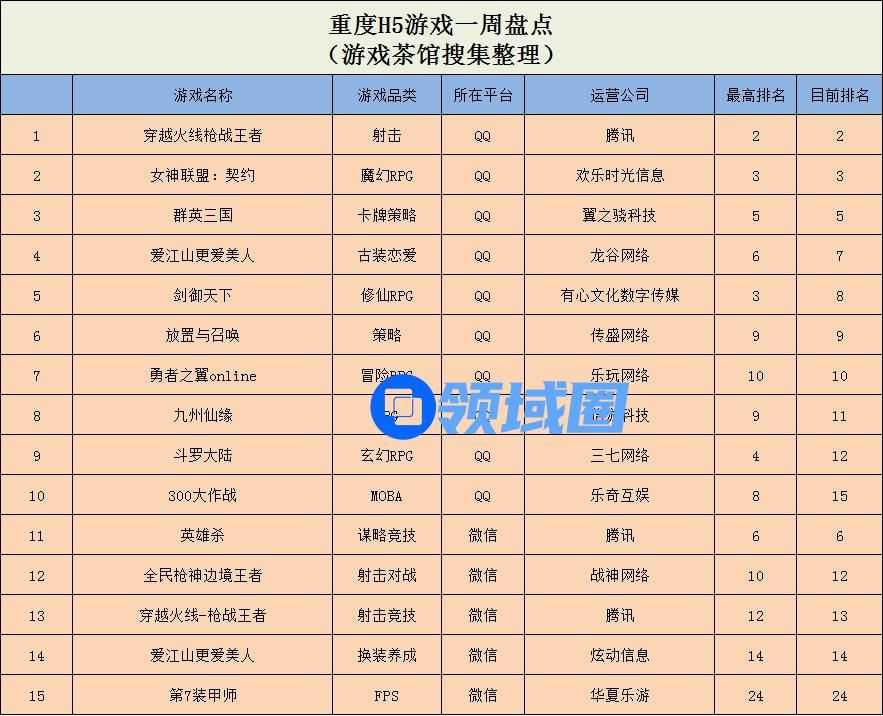 重度H5游戏:《穿越火线枪战王者》再次登顶,《群英三国》重回TOP5