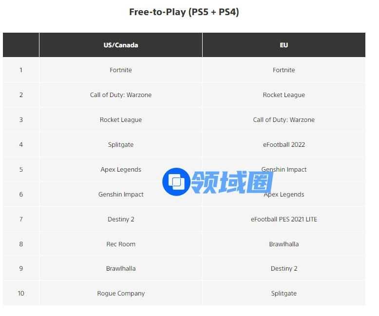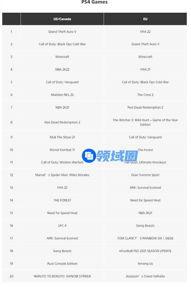 PS4北美地区下载量最高的游戏为《GTA5》,欧洲地区下载量最高的游戏为《FIFA 22》。