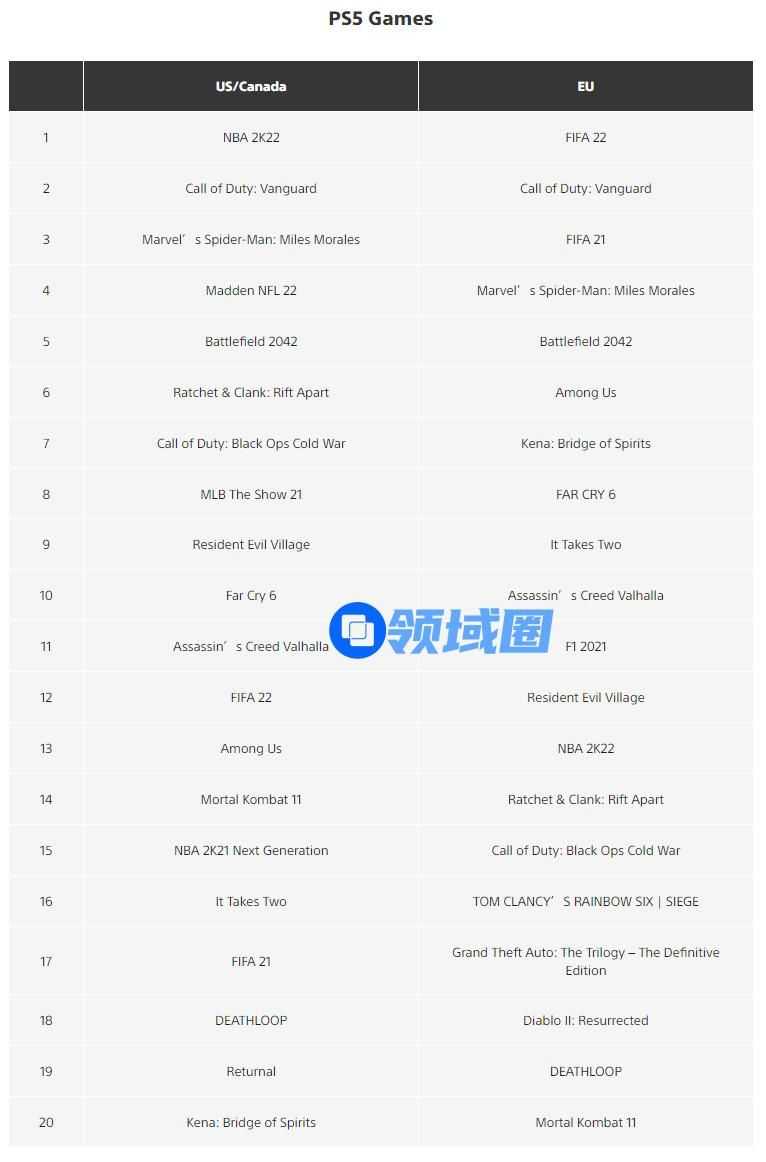 PS5北美地区下载量最高的游戏为《NBA 2K22》,欧洲地区下载量最高的游戏为《FIFA 22》。