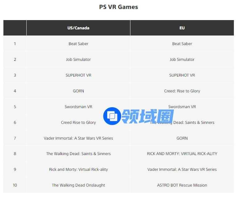 PSVR北美地区和欧洲地区下载量最高的游戏均为《节奏光剑》。
