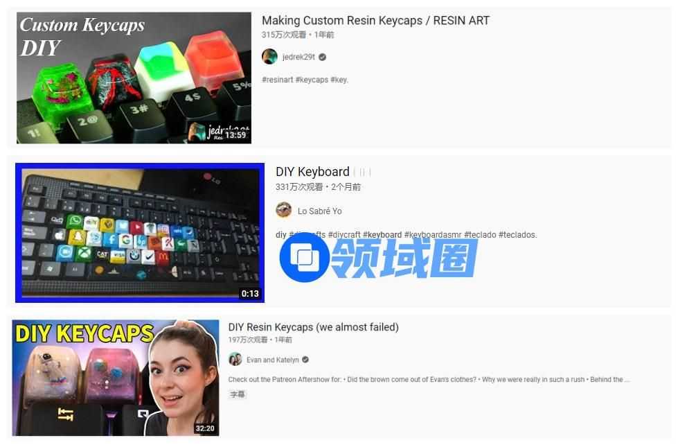 目前在国内外各大视频与社交网站上,依然能够看到大量的键盘DIY相关内容。这些博主们经过选择模型、滴胶、浇筑、脱模、装饰,就能快速制作出一套漂亮的、独特的键帽,同时制作过程中的系列操作也能为观众带来舒爽的解压体验,因此这类DIY视频得到了大量网友的喜爱,目前在YouTube平台中,已有多支此类视频播放量达300万。