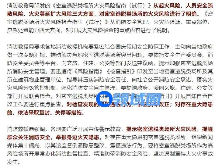 而在此之前,针对密室逃脱类场所火灾风险大的问题,应急管理部消防救援局刚刚印发了《密室逃脱类场所火灾风险指南(试行)》《密室逃脱类场所火灾风险检查指引(试行)》,要求从业单位要对照《风险指南》《检查指引》自查自改,相关部门、单位要严查严管,确保安全。