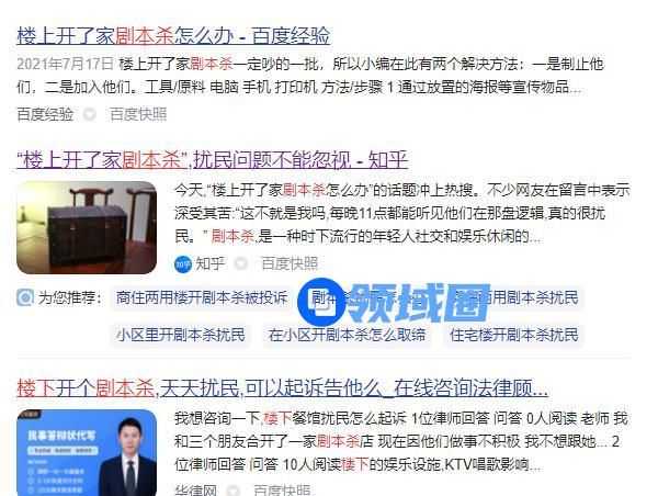 而在知乎等多个社交平台,更是不乏关于“楼上开了家剧本杀怎么办”的讨论。甚至直接在百度搜索该话题,也能看到多个关于扰民、起诉等相关热门回答。