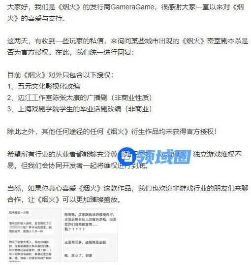 这种情况甚至波及到了其他领域。例如,此前国产独立游戏《烟火》的发行商GameraGame发文称,某些城市出现了《烟火》密室剧本杀,且剧情与游戏几乎一致,但这些相关衍生品均未获得官方授权。