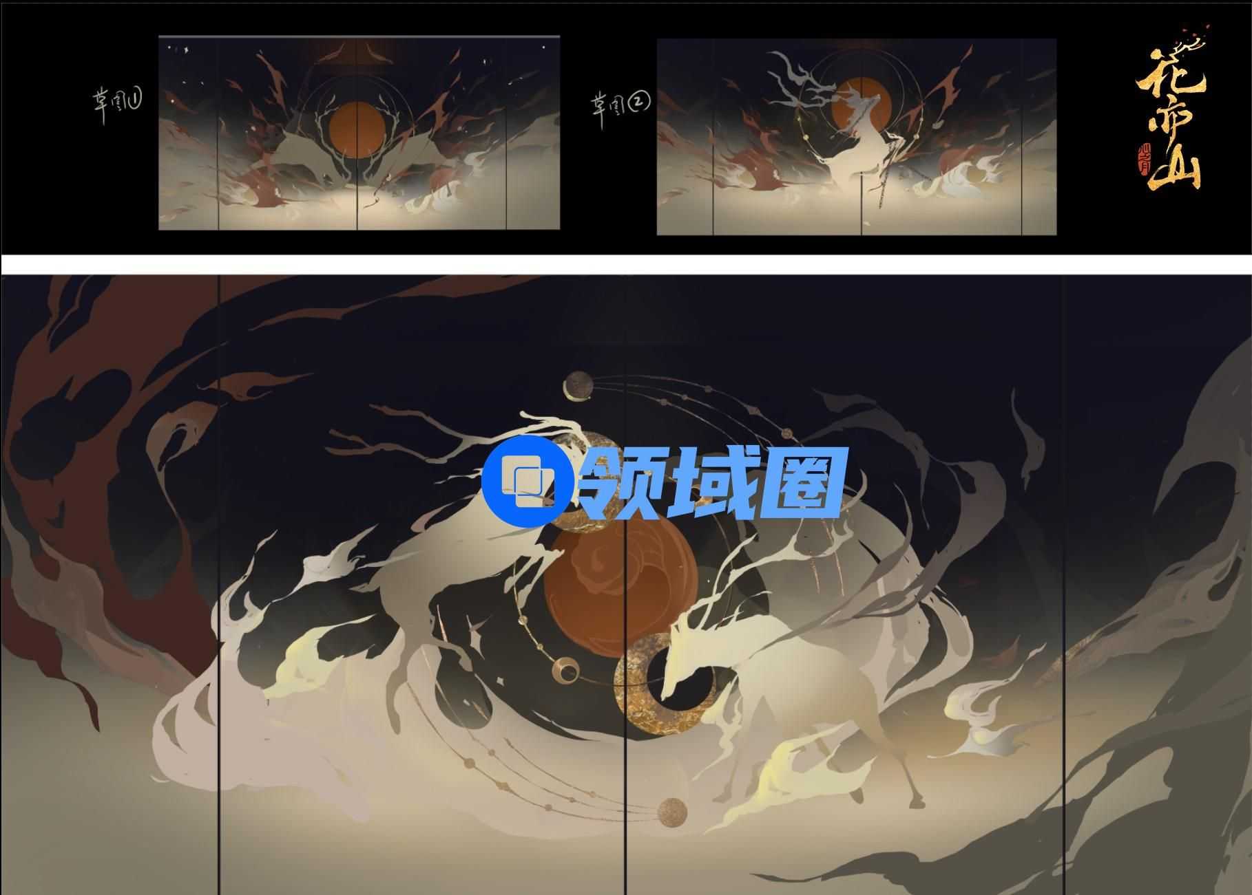最终他们选择将原双鹿图使用的主色 "绢纨"换成“香炉紫烟”、“紫菂”、“拂紫绵”、“三公子”等多种紫色。101工作室的美术们根据画面的每一个部分所代表的意向来细细调节其中紫色表现,在表达轻盈感觉的云彩上就使用了最浅的“香炉紫烟色”,而由星月相映的涡浪则使用了自古以来就代表权威和尊贵的“三公子色”。