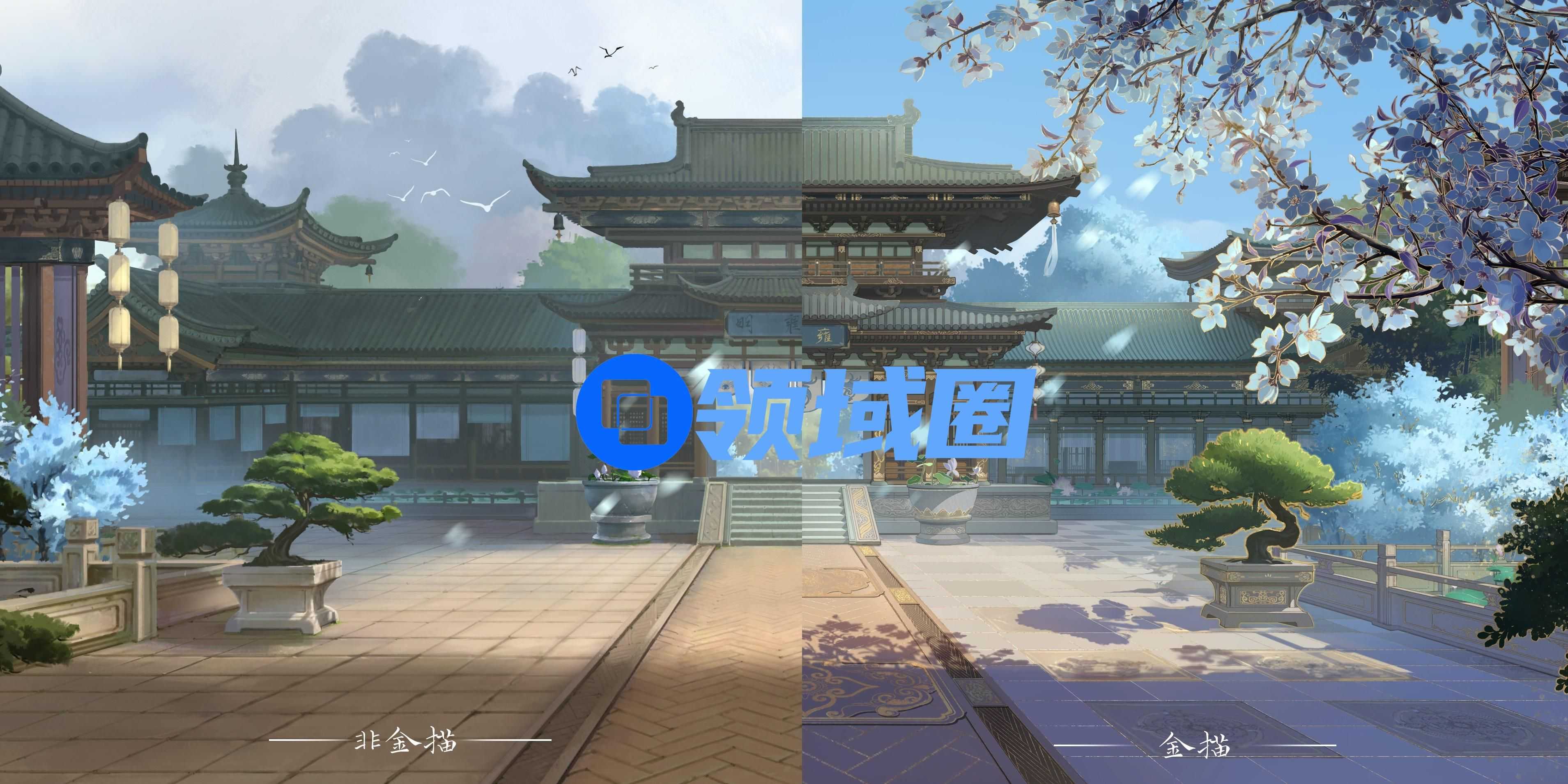 如果我们将《花亦山心之月》的背景画面进行放大,我们会发现画面中的建筑整体都有金描装饰,走廊上的浮雕、瓦缝间的反光都运用了描金装饰。尽管这些场景细节在手机上是几乎看不清的,但项目组还是坚持选择对每一个细节进行了刻画以此来保证整个画面的生命力。