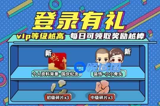 活动期间,登录游戏即可免费领取奖励!VIP等级越高,可领取的奖励越棒!除此之外,根据您在活动期间累计登录的天数,还会为您发放额外奖励,包含全新装扮:小小骨头、国庆纪念全新个人资料背景等!