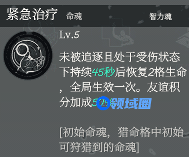 首先是最常用的紧急治疗,残血情况下,45秒自动回复两格血,无论是被追逃离还是倒地被扶起来时都有比较明显的效用,更何况还有积分加成,不得不说是一个性价比极高的命魂,也是一个很多人选择的命魂。