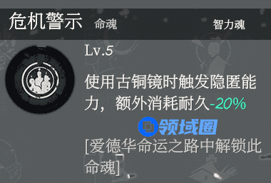 危机警示是使用古铜镜时隐身,并减少消耗耐久,延长使用时间。这个就不用多说了,清楚明了,但因为使用古铜镜时隐身依然还是有轮廓的,并不是完全消失,所以限制颇多,实用性不大。