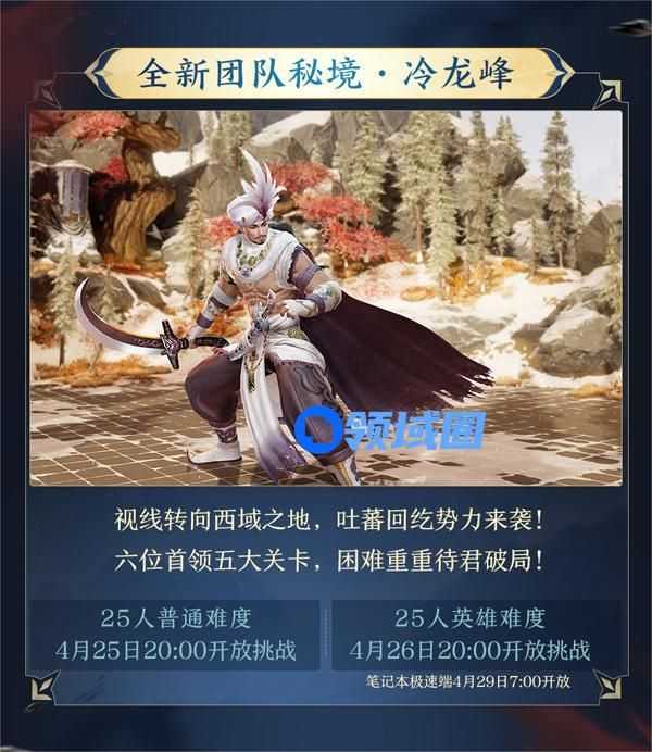 狂龙盘踞,云雾掩迷,全新团队秘境“冷龙峰”携六位首领五大关卡正式亮相,引领大家的视线从中原投向有着沙漠戈壁和重岭雪域的西域之地。侠士将深入人迹罕至的西北雪峰,与吐蕃、回纥、清燕楼等多方势力交手过招,揭晓那些隐秘往事。在完成资料片预热活动任务【箭在弦上】后,侠士还可前往龙门荒漠的柳亭澜处,接取冷龙峰秘境起始任务【疾风扫叶】,完成任务后可获得13950品戒指奖励,不要错过哦!