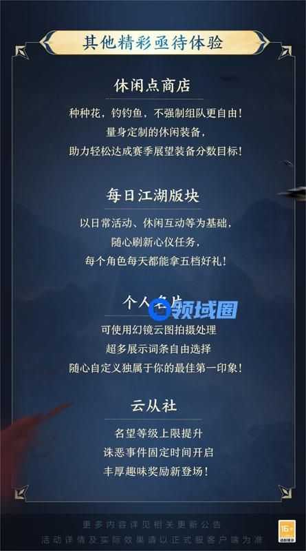 全新宠物奇缘同步亮相,三只萌宠将为侠士们的江湖之旅增添更多的乐趣与温情!在新赛季中,新“休闲点”商店将助力PVX侠士们单人轻松达到赛季展望的装备分数毕业目标,4月29日维护前休闲点获取速度将翻倍提升!玩你所想玩的,积累“休闲点”还将可兑换精品拓印外观【栖林隐】哦!还有更多关于个人名片、“每日江湖”版块和云从社的精彩内容,期待侠士们的体验!