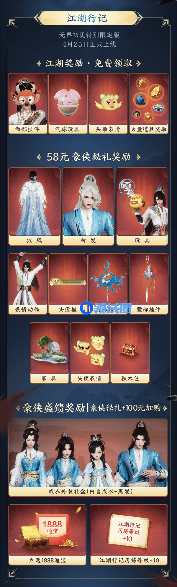 值此无界初见的隆重时刻,为答谢侠士们长久以来的支持与喜爱,特别限定版“江湖行记”将于全新资料片公测时重磅登场,超可爱的面部挂件等多样好礼全民免费赠送!“豪侠行记”也将同步惊喜加码,在领取免费好礼的基础上更有全新披风和成衣外装礼盒超低价打包特惠!相较于往期188元档的“豪侠行记”,本期奖励不但降价钜惠,还带来了前所未有的丰厚好礼,错过这次,再等N年!