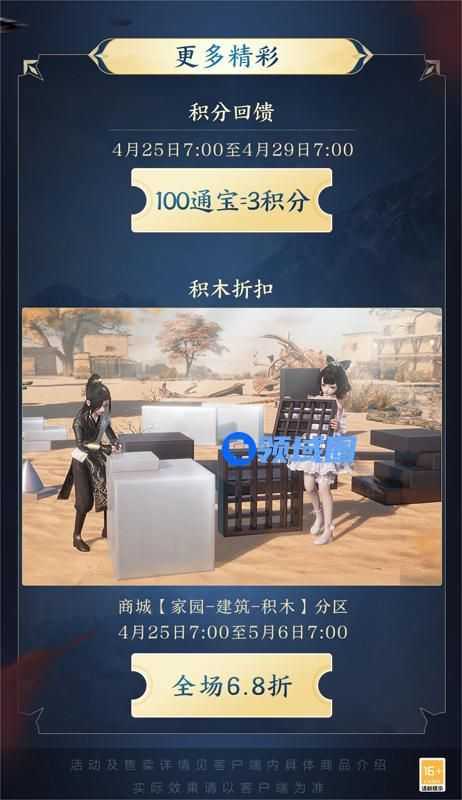 此外更有三倍积分回馈限时开启,家园积木全场6.8折,群侠共迎江湖新篇,处处逸趣惊喜连连,不要错过哦!