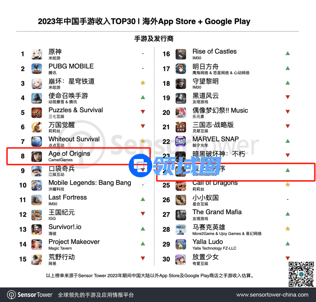 在 Sensor Tower 发布的“2023 年中国手游发行商海外收入排行榜”中,壳木游戏位居第 7 位,同比提升 1 位。而旗下游戏,《Age of Origins》和《War and Order》,还上榜了“2023年中国手游出海排行榜”,分别排名第8和第24名。