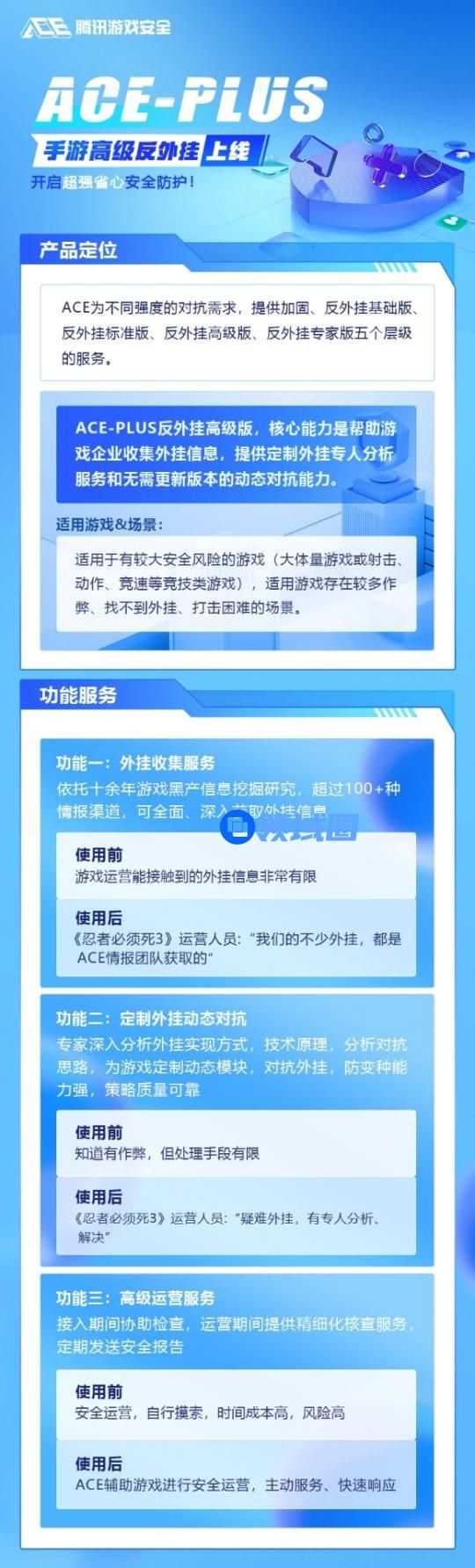 根据游戏厂商的不同的安全需求,ACE的手游反外挂方案由轻到重分成了5个类别,其中ACE-PLUS手游反外挂方案是属于第四层,仅次于专家版。其核心能力主要是帮助游戏企业挖掘外挂信息,以及提供无需更新版本的动态对抗能力和定制外挂专人分析等服务。