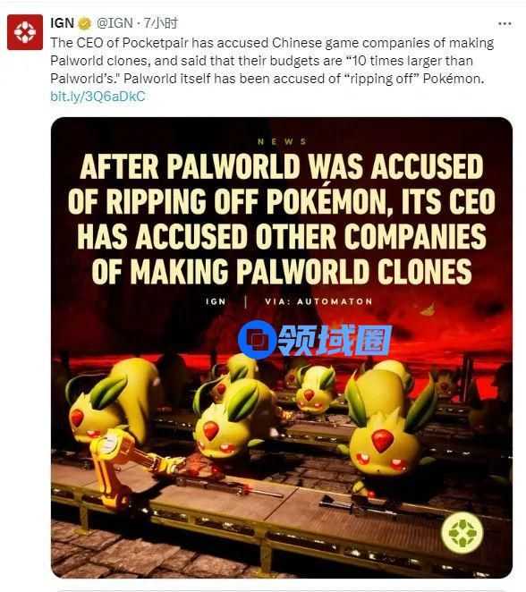 对此,腾讯并没做任何回应,不过有意思的是,IGN却对此事进行了报道,并发推认为该社长是在“指责”中国游戏公司在制作类帕鲁的克隆游戏,强调他们的预算成本是帕鲁的十倍之多。同时IGN还表示《幻兽帕鲁》本身也被指控“抄袭”宝可梦等游戏。