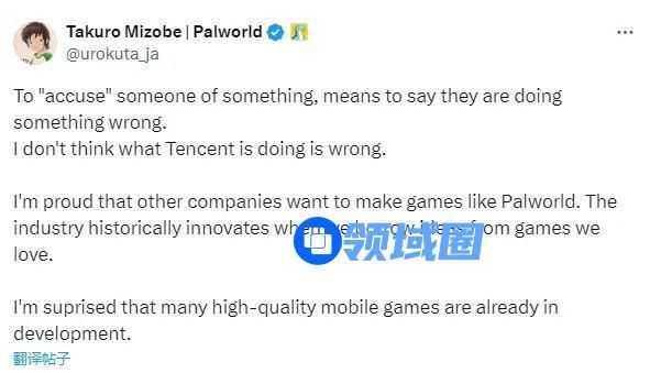 对此,帕鲁社长显然认为IGN所说的“指责”有些不妥,他随后回应道:“指责某人某事,意味着他们做错了什么,但我不认为腾讯做错了什么。我很自豪其他公司也想制作类帕鲁的游戏,纵观历史,我们也喜欢从自己喜欢的游戏中借鉴创意,这样才能推动整个行业创新。我很惊讶居然又这么多高品质的手游正在开发中。”