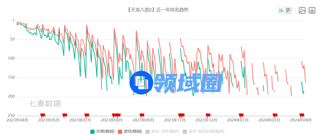 七麦数据显示,《天龙八部2手游》上线之初,曾短暂登顶中国区iOS畅销榜,但随后开始滑落,而今年以来,《天龙八部2手游》不时出现在游戏畅销榜100-200名。