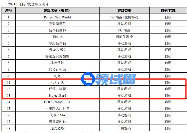 比如说,2020年年报中,完美世界曾公布了《代号:R》《代号:棱镜》《朝与夜之国(Project Bard)》等多款重磅产品。