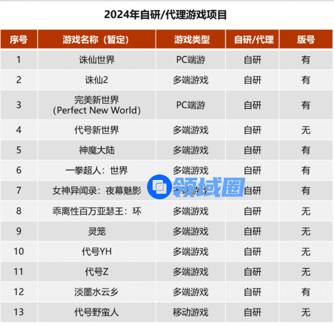 财报显示,2024年,完美世界自研/代理游戏项目有《诛仙世界》《诛仙2》《完美新世界》《代号新世界》《神魔大陆》《一拳超人:世界》《女神异闻录:夜幕魅影》《乖离性百万亚瑟王:环》《灵笼》等13款产品。