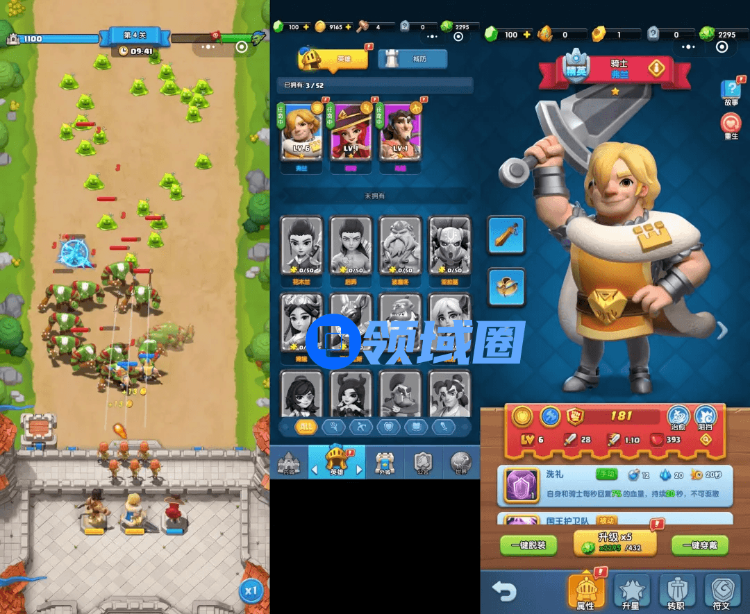 与原型《轰隆隆佣兵团》相较,《百炼英雄》整体变化不大,实际上还是一款轻度包装的RPG游戏。游戏中,玩家需要组建队伍,通过摇杆控制队伍进行关卡探索,在消灭野怪、砍树、挖矿石的过程中完成任务,获得肉块、木材、水晶和金币等资源,而后玩家可以消耗这些资源解锁更多地图和建筑、召唤更多英雄或对英雄进行升级。