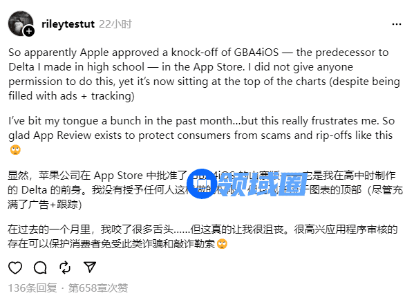祸不单行的iGBA同时被认为抄袭了Riley Testut的开源作品GBA4iOS,Testut也因此于周六在Threads上发文嘲讽了上架iGBA的苹果。值得一提的是,GBA4iOS也只能在App Store以外的渠道才能获取到。