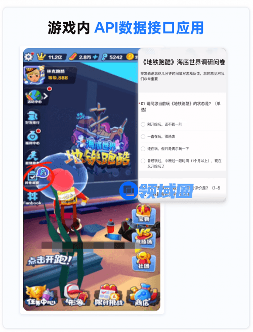 调研数据打通游戏账号:需要在《地铁跑酷》游戏内,对玩家开展了游戏版本体验与活动满意度的调研。再通过用户的ID,关联其游戏数据与用户画像,进而深入分析用户需求,并给对应的用户发放活动奖励。