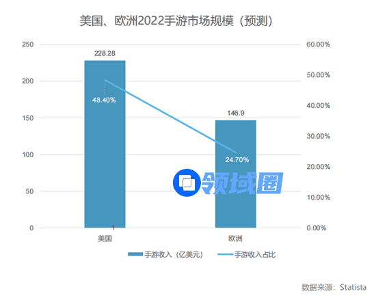 Statista预估2022年整个欧洲手游规模约146.9亿美元。中国手游在欧洲市场的收入规模有望在2025年由现在的14亿美元增至27亿美元。