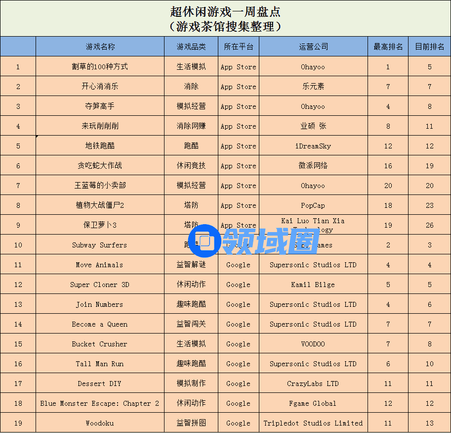 超休闲游戏方面,在App Store免费游戏榜单中,Ohayoo《割草的100种方式》连续第二周稳坐榜首;Google Play免费游戏榜单中,本周再次新登榜单5款新游。