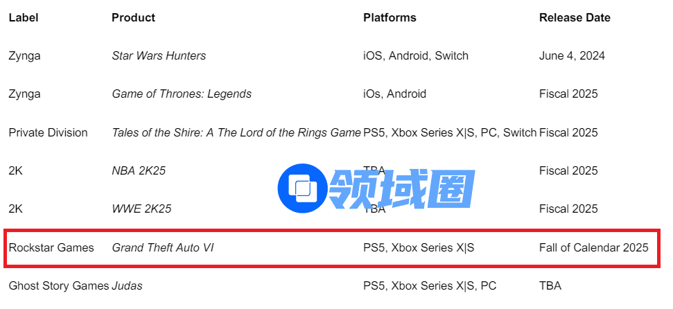 同时,T2财报公布了未来的游戏发售计划,《GTA 6》确定将于2025年秋季发售。