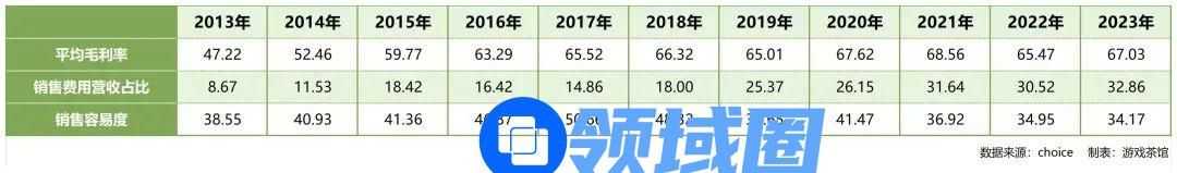 2013年,游戏厂商销售容易度为38.5,到了2017年,上升到了峰值50.66,随后开启了下跌趋势。2023年,销售容易度进一步下探到了34.17。这也是测算数据中,该衍生指标的最低值。