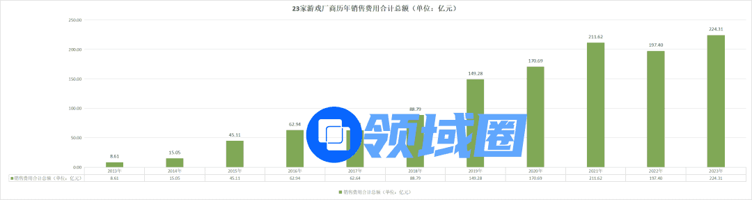 从历年数据来看,游戏厂商的销售费用总额逐年增高,达到了历史新高。去年,23家游戏厂商销售费用总额达到了224.31亿元,同比增长了13%。
